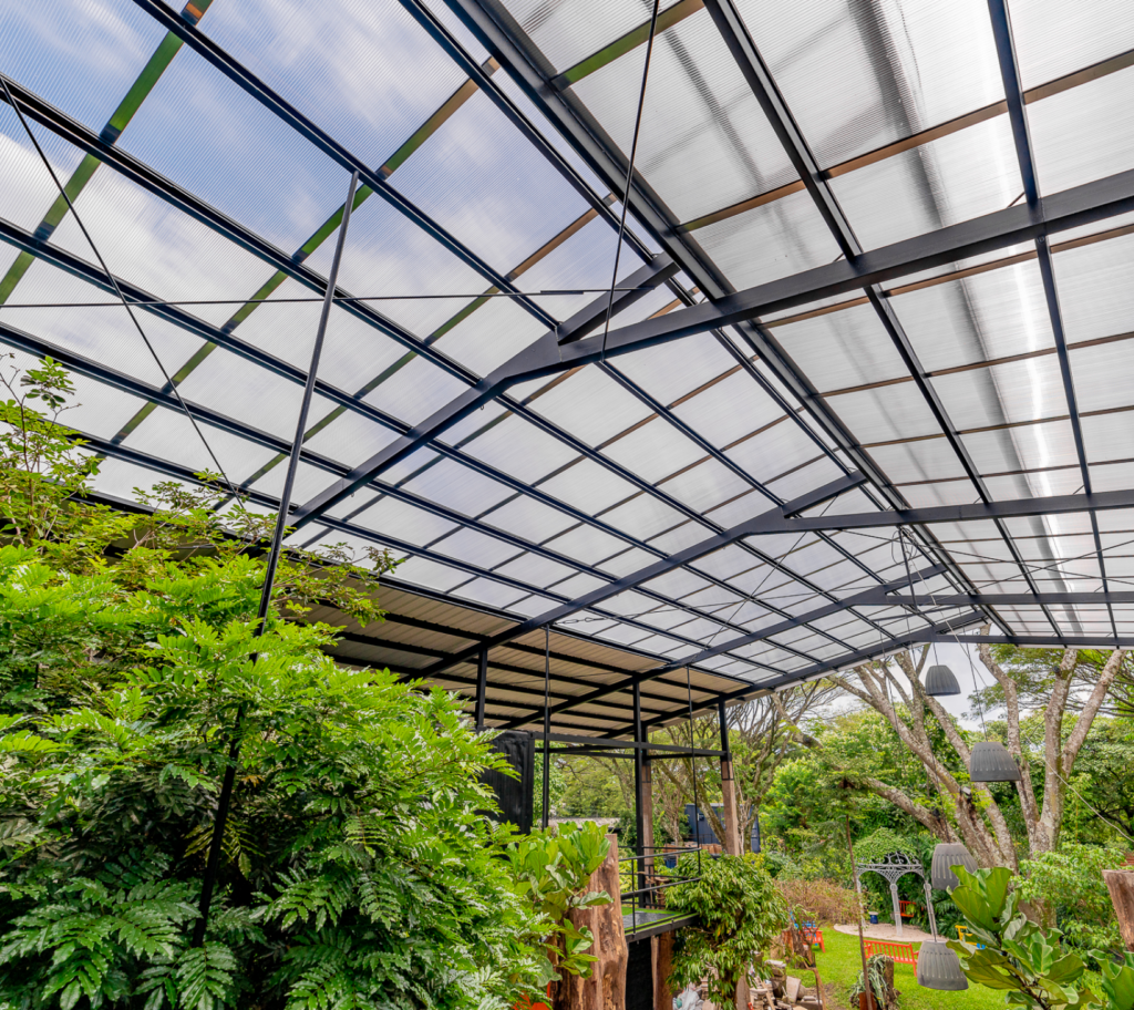 A pergola covered with Apollo Clear Skypoly sits over a brown tile patio with outdoor furniture.